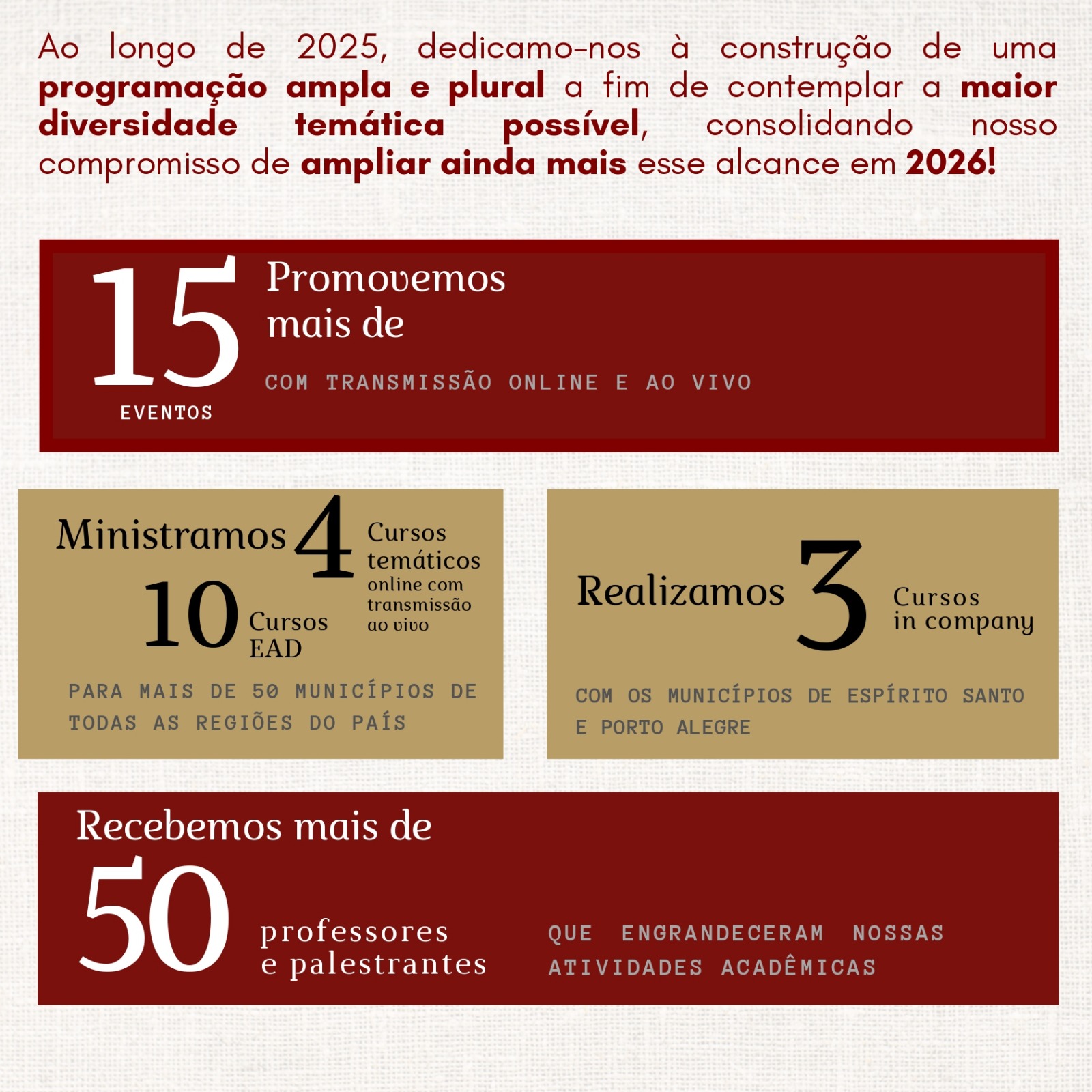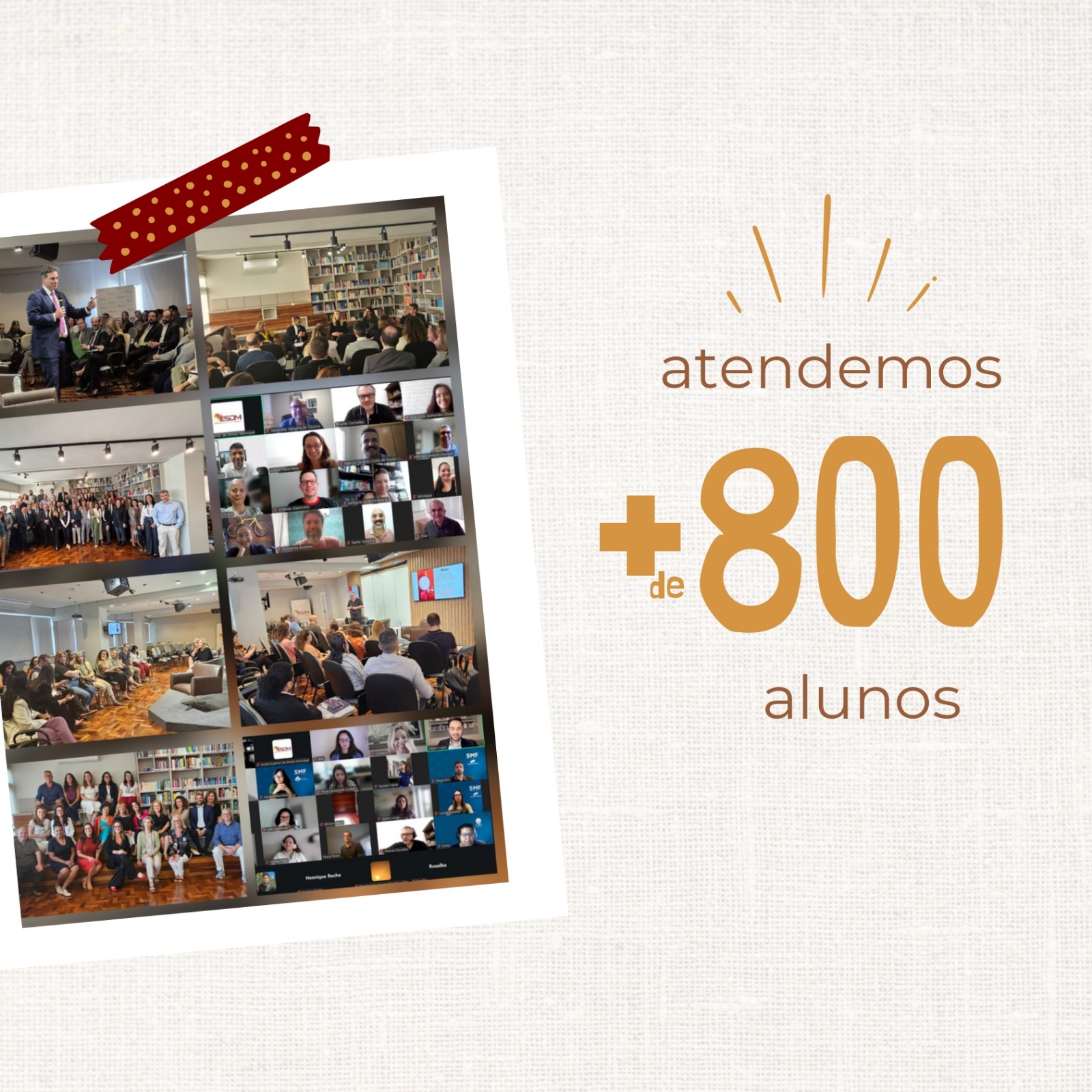 Durante o ano, a ESDM promoveu cursos, seminários, webinars, palestras e atividades acadêmicas com transmissão online e ao vivo, alcançando profissionais de mais de 50 municípios, em todas as regiões do país. Foram mais de 15 eventos realizados, incluindo cursos temáticos, cursos in company e formações na modalidade EAD, reunindo professores, palestrantes e alunos em torno de temas atuais e relevantes para a gestão pública e o Direito Público. Ao todo, mais de 800 alunos participaram das atividades formativas da ESDM, consolidando espaços de aprendizado, troca de experiências e construção coletiva do conhecimento.