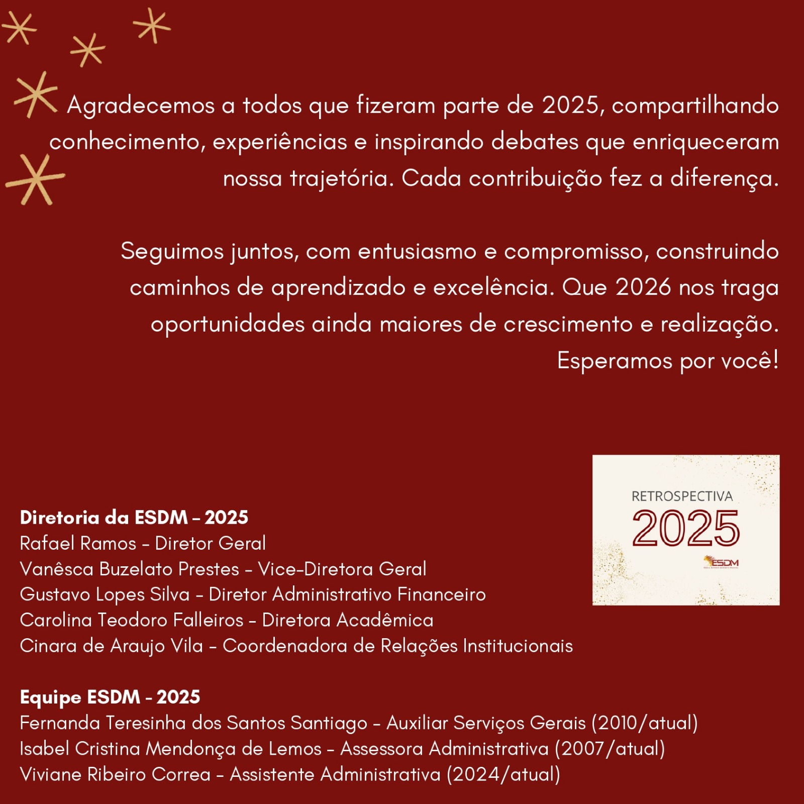 A ESDM agradece a todos que fizeram parte de 2025 — docentes, palestrantes, alunos, parceiros e equipe. Cada contribuição foi essencial para essa trajetória. Seguimos juntos, com responsabilidade institucional, entusiasmo e compromisso com a excelência, preparando novos caminhos de aprendizado e desenvolvimento para 2026.