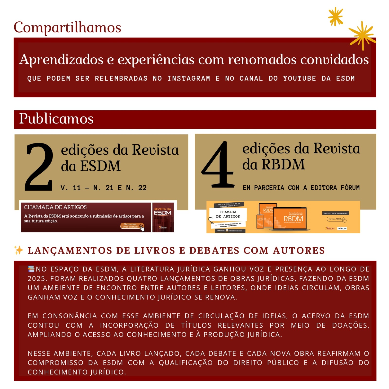 A produção acadêmica teve papel central em 2025. Em parceria com a Editora Fórum, foram publicadas quatro edições da Revista Brasileira de Direito Municipal (RBDM). Também foram publicadas duas edições da Revista da ESDM, reforçando o compromisso institucional com a difusão do conhecimento jurídico qualificado.